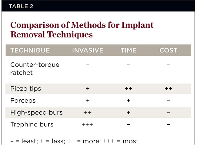 2. Immobile implant—partially or fully osseointegrated. Methods of immobile implant removal include: use of counter-torque ratchets, screw removal devices, piezo tips, high-speed burs, elevators, forceps, and trephine burs.