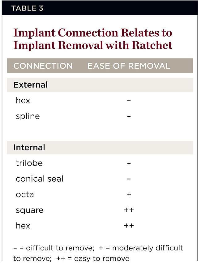 An external connection implant has the hex coronal to the implant body, whereas an internal connection engages within the implant body. An external hex implant requires an adapter when removing the implant via the counter-torque technique. Removal is easier when the implant driver connects directly to the internal connector. Therefore, an internal connection implant is much easier to remove than one with an external hex implant because the connection is more rigid (Table 3). However, complications may occur when removing an implant with an internal trilobe connection using the counter-torque ratchet. The neck portion of this type of implant, especially those with smaller diameters (ie, 3.5 mm), has been observed to fracture during removal procedure if the reverse torque is more than 45 Ncm (Figure 15).