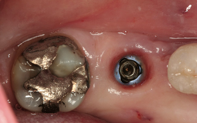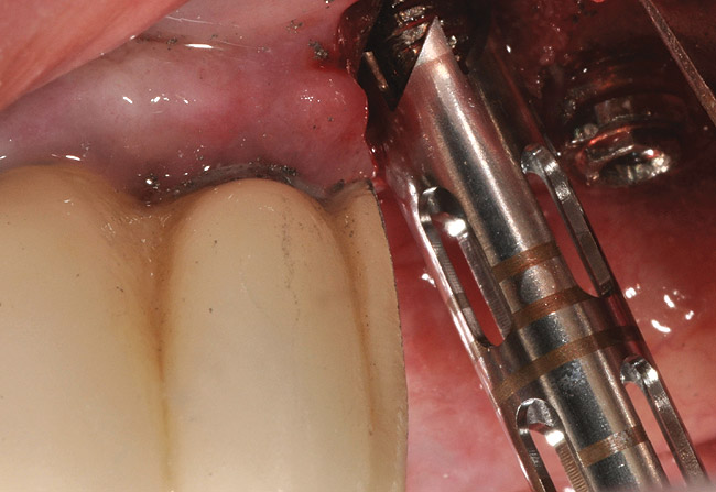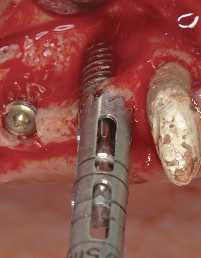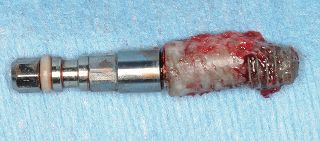 Implant failure can have a multifactorial etiology. Causes related to early failure include: overheating of the bone during osteotomy preparation; overpreparation of the osteotomy; implant contamination during surgery; poor bone quality; lack of primary stability; and macro-motion caused by overload or parafunction.1 Implants with any of the aforementioned etiologies are usually mobile, and early removal is easily performed. Late failure is most often related to peri-implantitis, occlusal trauma, implant fracture, and/or implant overload1; many late-failing implants remain partially integrated with no mobility. Implants that fail due to peri-implantitis show many clinical signs similar to those found around periodontally diseased teeth. These signs include bleeding on probing, suppuration, pain, increased probing depth, radiographic evidence of bone loss, presence of periopathogens bacteria, and site-specific infections.2 However, unlike teeth with moderate or advanced periodontitis, many implants with peri-implantitis do not display mobility.
