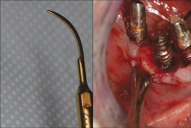 Piezo tips (Figure 6) allow for better intraoperative control than high-speed burs during bone-cutting because they prevent damage to the surrounding soft tissue.20,21 Typically, a diamond tip for extraction (eg, EX1, EX2, EX3, Piezosurgery, Inc, www.piezosurgery.com; BT1, BT3, ST1, ST2, ST3, ST4, LT1, Extraction Kit Tips, Vista Dental, www.vista-dental.com; BS1, BS2L, BS2R, BS4, BS5, BS6, Satelec Extraction Kit Tips, Acteon North America, www.us.acteongroup.com) is preferred. Furthermore, the bone healing response following piezoelectric surgery seems to be more favorable than osteotomies performed with burs.22 However, when deep cuts into bone are necessary, the device is less efficient,23 and when the cutting speed is decreased the tip's temperature rises. Therefore, it is necessary to pause several times during the removal procedure to let the tip cool down; also, the use of copious irrigation with cold saline is recommended.