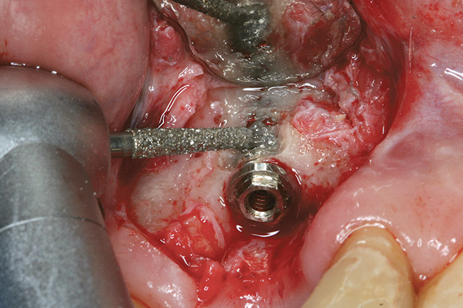The use of high-speed burs (Figure 7) under copious irrigation is an efficient method to remove a failed implant. However, air from the high-speed handpiece can be forced into a surgical wound or a laceration in the mouth causing an air embolism.24 The crown and abutment should be removed prior to using the burs to gain better access to the implants. Usually a long, thin diamond bur (eg, 5863, 5850, Brasseler USA, www.brasselerusa.com; 757, Kerr Corporation, www.kerrdental.com; 166/016, Shofu Dental Corp., www.shofu.com) is preferred over a carbide bur, because the diamond bur is easier to control and produces a more efficient, thinner cut. Cuts should be made using high-speed burs and copious irrigation on the mesial and distal aspects of the implant to prevent damage to the buccal plate of bone. Oftentimes this is sufficient to loosen the implant and remove it with the CTRT or RST. When using high-speed burs, the residual apical part of the implant should be carefully approached in order to prevent damage to anatomical structures such as the sinus floor, inferior alveolar nerve, and mental foramen. Moreover, particles of the implant surface may enter the healing wound and should be removed as part of the procedures. When the implant is in close proximity to a vital structure before using the burs, accurate radiographs and a computer axial tomographic (CAT) or cone beam (CB) scan is recommended to locate anatomical structures.