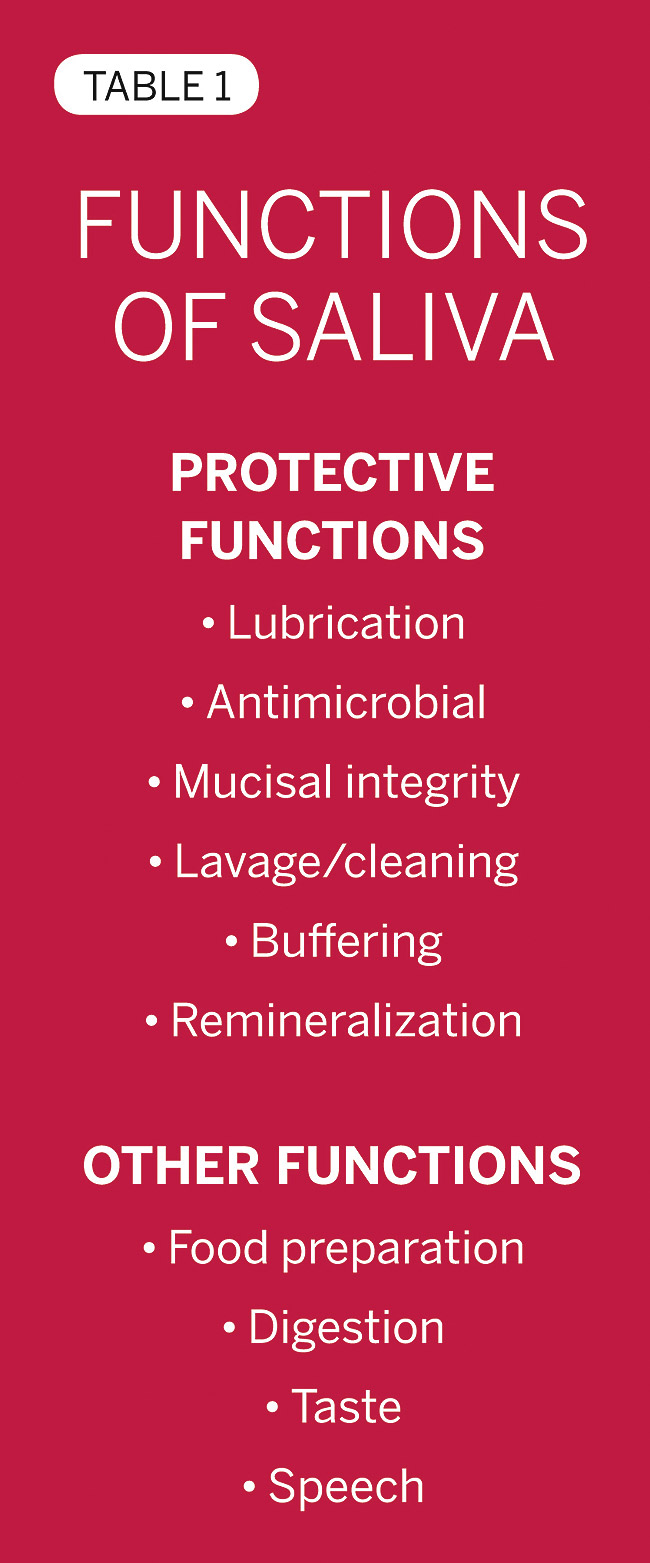 Saliva is very protective of the oral cavity and also helps with nourishment and proper speech. Protective functions include lubrication, antimicrobial activity, mucosal integrity, lavage, cleansing, buffering, and remineralization. In addition, saliva aids in food preparation, digestion, and taste. Finally, without adequate moisture, oral dryness makes proper phonetics difficult, subsequently affecting speech (Table 1).