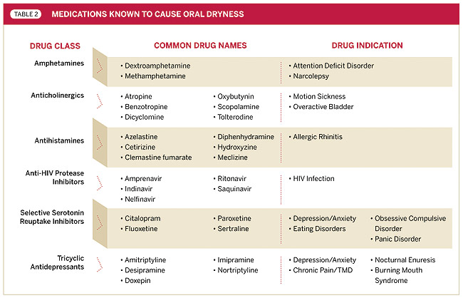 Medication-induced xerostomia is a common and significant side effect of many medications including over 500 listed in the Physician's Drug Reference.2,4,7 This risk of developing dry mouth increases with the number of drugs taken. Because of this known synergistic effect of medications, older people are more likely to be affected. There is often a close temporal relationship between the drug initiation and the complaints of oral dryness. These symptoms may resolve with drug withdrawal. Common medications known to cause oral dryness are summarized in Table 2.