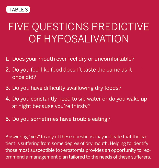 Identifying patients at risk of developing salivary gland hypofunction is vital for the oral healthcare professional. A comprehensive medical history including the assessment of systemic and local disease, history of trauma, and a complete medication list is a vital first step in this process. There are five simple, symptom-related questions that are predictive of hyposalivation and can aid in identifying at risk patients (Table 3).2,4 In addition, a thorough physical examination is needed, which includes extraoral and intraoral assessment and possibly the measurement of salivary flow rates or serologic tests when necessary. Occasionally, imaging such as specialized salivary studies, MRI, or CT, is needed. Salivary gland biopsies including minor gland biopsies, fine needle aspiration, and major gland biopsies may also be indicated in certain patients.