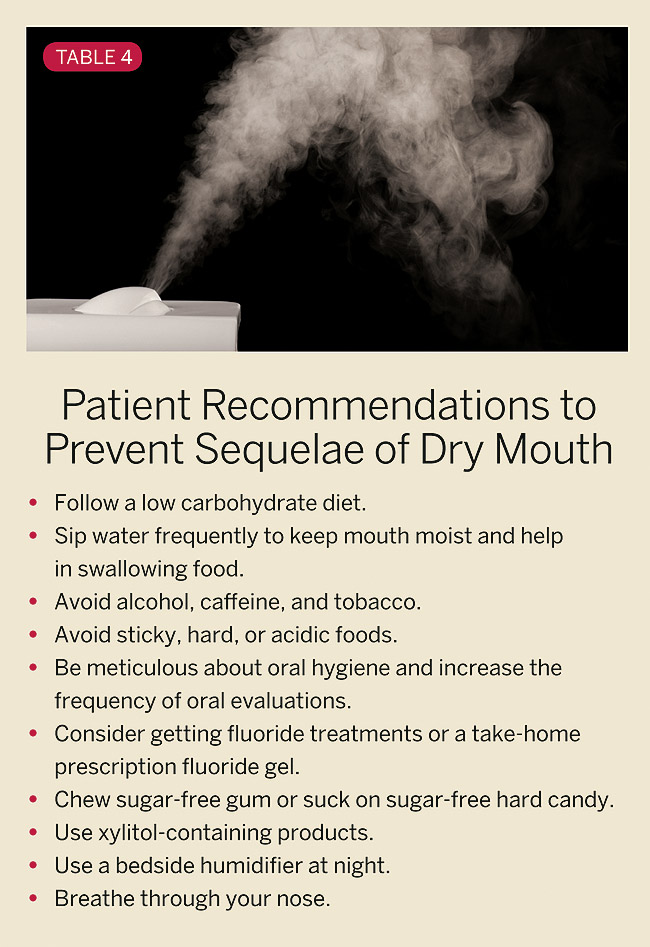 The clinical complications of hyposalivation and xerostomia include, but are not limited to, caries, periodontal disease, mucosal abnormalities, halitosis, candidiasis, and difficulty with mastication, swallowing, and speaking.9,18 Therefore, the clinician cannot underestimate the importance of preventive measures in the overall management of a patient with reduced saliva. Increased frequency of oral and dental evaluation and recall maintenance every 2 to 3 months is imperative. Nutritional counseling recommending a low carbohydrate diet is also needed. In addition, topical fluoride applications, at home or in the dental office, with solutions, gels, foams, or varnishes, is important in preventing dental caries. The identification and management of other oral conditions such as candidiasis, bacterial infections, and ill-fitting prostheses is important.