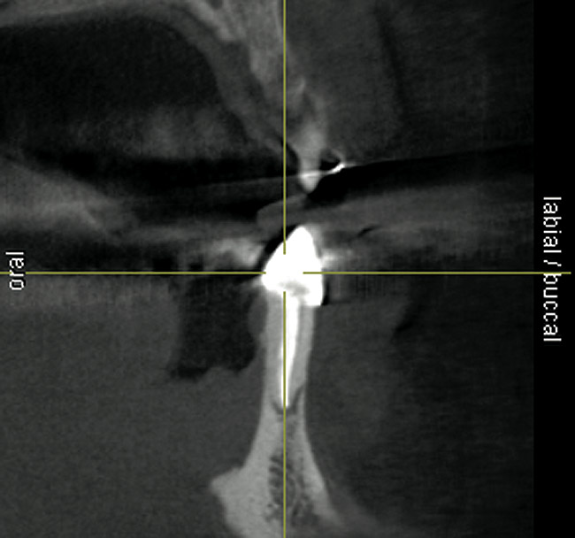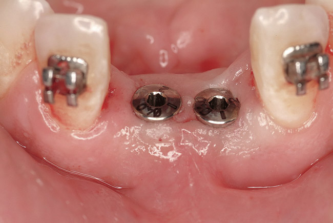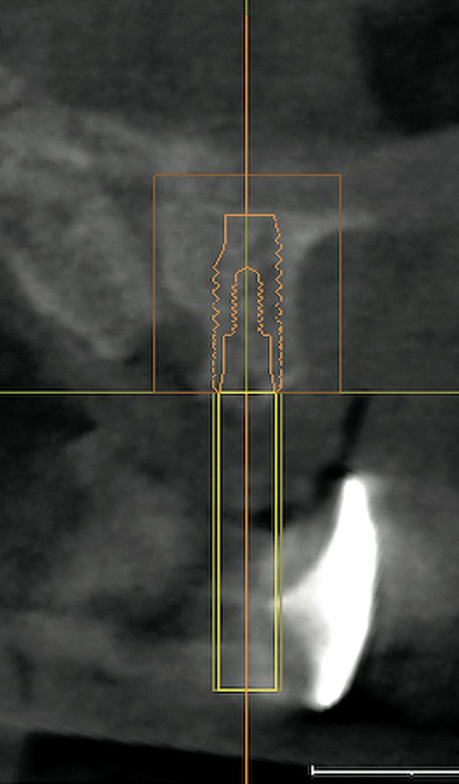 Active tooth movement was complete approximately 6 months after surgery, and a second CBCT scan was taken to evaluate the site prior to implant-placement surgery. With the adequate presence of both hard and soft tissues in the edentulous area (Figure 11), it was determined that no further tissue augmentation was required to place implants in their prosthetically desired positions. At this point, the virtue of not having to deal with the removal of the mesh was apparent. Because regeneration was successful, and surgical re-entry to remove a titanium mesh and fixation screws was unnecessary, a flapless, computer-guided surgery could be considered utilizing software to fabricate the templates (Figure 12). This would reduce morbidity for the patient and enhance implant placement accuracy. Because the procedure was minimally invasive, postoperative bleeding was minimal, making it easier for the orthodontist to replace the arch wire and attached denture teeth for fixed provisionalization postoperatively.