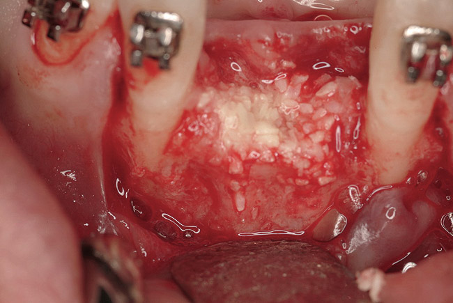 The patient, a 39-year-old woman, presented at the inception of multidisciplinary therapy. Prior to starting comprehensive orthodontic treatment, it was determined that tooth Nos. 24 and 25 were deemed hopeless (Figure 3). Cross-sectional views obtained from cone-beam computer tomography (CBCT) demonstrated deficient labial and lingual cortices at the time of presentation (Figure 4 and Figure 5). Full-thickness flap reflection and delicate extractions were done, utilizing periotomes and forceps and taking precaution to avoid unnecessary trauma and further bone loss; tooth Nos. 24 and 25 were removed (Figure 6). Following thorough debridement with ultrasonic and hand instrumentation, the defects were obturated with a mineralized allograft (freeze-dried bone allograft [FDBA], Musculoskeletal Transplant Foundation [MTF] Tissue Bank, www.mtf.org) (Figure 7). For purposes of graft containment, a traditional barrier membrane may have been chosen; however, due to the compression of the overlying flap and an anticipated 6 to 9 months before implant placement was expected to occur, a thin or knife-edge crest ridge anatomy could result in this area. Therefore, a rigid, resorbable mesh was utilized to provide graft containment and space maintenance (Figure 8). This PLGA-composed mesh was trimmed extraorally to the desired size of the defect, then placed in a sterile, warm water bath at 70°C for about 10 seconds. This temporary warming allows for 3-dimensional (3-D) contouring of the flat mesh to the desired shape needed to reconstruct the alveolar ridge. To prevent movement of the mesh in situ, it was affixed to the labial cortex with screws composed of the same PLGA polymer. A dermal allograft was placed over the graft site to augment the volume of soft tissue in this area of typically thin keratinized mucosa (Figure 9). The flaps were closed in a tension-free manner after a facial periosteal-releasing incision (Figure 10).