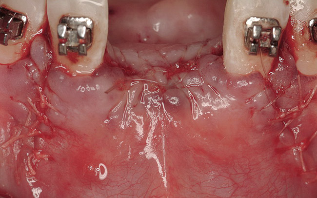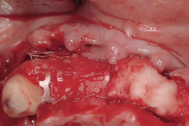 One of several drawbacks to this technique is resorption of the block, resulting in suboptimal bone regeneration. Cordaro7 et al reported approximately 25% horizontal graft reduction using this technique. Methods to reduce the resorption of autogenous block grafts have been tested, often with positive results. Von Arx and Buser8 evaluated the efficacy of combining block grafts with anorganic bone particulate and resorbable porcine collagen membranes. They reported minimal “surface resorption” with this technique. In the rabbit model, Kim and co-workers9 demonstrated the synergistic effect of collagen membranes and block grafts, and further demonstrated that the application of a “double membrane” technique resulted in smaller amounts of resorption compared to a single-layer technique.