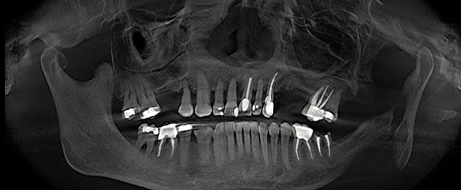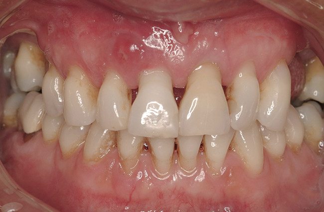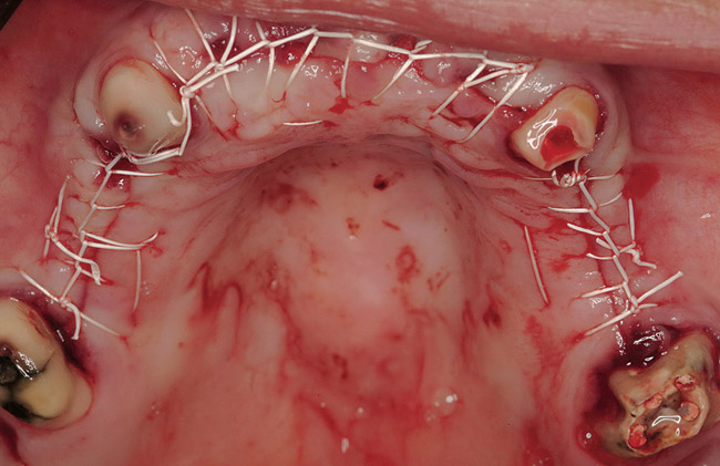 A 46-year-old woman presented with advanced chronic periodontitis and had already lost several maxillary and mandibular teeth (Figure 13 and Figure 14). She initially complained of pain in the maxillary anterior sextant, where a draining sinus tract between tooth Nos. 7 and 8 was evident. The patient desired a fixed restoration and was unwilling to wear a removable prosthesis, even on a temporary basis, if possible. It was decided that tooth Nos. 2, 6, 11, and 15 would be retained to support a fixed, provisional bridge, while the patient’s remaining teeth would be extracted and bone augmentation performed, followed by implant placement (Figure 15). Extraction of the maxillary teeth with the exception of these four teeth was done to simplify provisionalization.