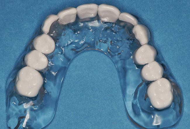 The patient returned approximately 5 months after the augmentation procedure for implant placement. Prior to this step, a CT scan was taken with the patient wearing a radiopaque scanning appliance, which was based on the final prosthetic treatment plan (Figure 19 and Figure 20). Planning software demonstrated adequate 3-D volume for implant placement in the regenerated area where rhBMP-2/ACS and PLGA mesh were combined. Removal of the provisional bridge permitted visualization of a healthy and symmetrical edentulous ridge (Figure 21). A tooth- and soft-tissue-supported template was seated to facilitate flapless, computer-guided implant placement (Figure 22). Because the patient desired a fixed, final prosthesis and a “full complement” of teeth with the exception of third molars, nine implants were placed. Although a full-arch prosthesis may be supported with fewer implants, the treatment plan anticipated that one or more implants could fail to osseointegrate due to the patient’s heavy smoking habit. With nine implants placed initially, both the surgeon and restorative dentist decided that a full-arch prosthesis would still be possible despite the potential loss of one or two implants. It was noteworthy that in the maxillary anterior sextant, the resorbable mesh in the area of tooth Nos. 7 and 8 enabled adequate hard- and soft-tissue dimensions for implant placements. Moreover, due to the resorbable properties of the mesh, a flapless, guided placement could be performed (Figure 23).