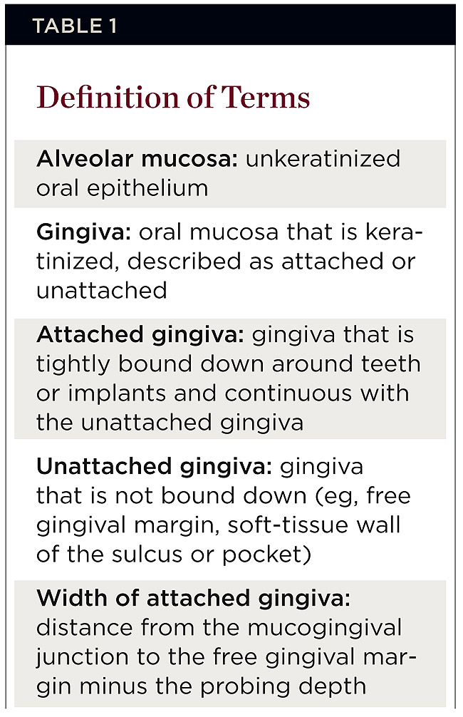 In response to perceived needs for KG, surgical techniques were devised to augment gingiva around teeth and implants.12 These procedures continue to be performed because of the persistent disagreement concerning the requirement for keratinized tissue to maintain health. The objective of this paper is to appraise the data and provide a perspective as to why generalized conclusions can or cannot be made regarding the need for KG to sustain health around dental implants. First, data related to the relationship between keratinized tissue and teeth are reviewed. Then anatomic differences in tissues surrounding teeth and implants are addressed. These data serve as background information for the discussion concerning the relevance of KG in maintaining peri-implant health. To avoid confusion about anatomic and histological terminology, definitions of terms used in this review are provided in Table 1. The specific type of tissue referred to in studies will be stated. Note that the terms keratinized mucosa and keratinized gingiva represent the same type of tissue and may include attached and unattached gingiva.