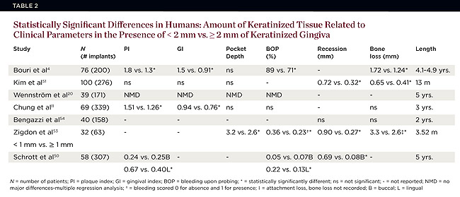 Three studies reported a higher plaque index (PI) around implants associated with < 2 mm of KG compared to > 2 mm KG (Table 2).4,10,50 Ostensibly, this was due to the tissues being movable or they were more tender to brush, so sites were avoided during oral hygiene. Others did not corroborate these findings.28,50-52 Schrott et al50 reported higher plaque readings on the lingual but not the buccal when both sides manifested a dearth of keratinized tissue.