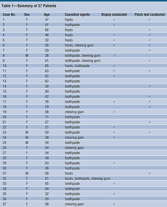 The authors examined the records from the database of the Stomatology Center at Baylor College of Dentistry in Dallas, Texas, and identified 65 cases from 1985 through 1998 that were classified as contact stomatitis caused by cinnamon flavoring agents. In 37 of the 65 cases, causative agents were identified, and the signs and symptoms disappeared after the patients discontinued the use of these agents. These 37 cases were used for this study. The other 28 cases were excluded because of the absence of records confirming the disappearance of lesions.