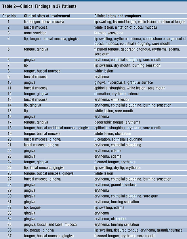 Patients in 16 cases (43%) described their symptoms as “sore mouth,” “irritation,” or “burning sensation.” Six of the 8 patients with lesions associated with foods complained of similar symptoms.