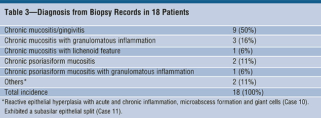 The results of the histopathological examination are shown in Table 3. Of the 18 patients who had histopathological examinations, 13 (72%) were diagnosed as having chronic mucositis or chronic gingivitis. Three others showed chronic psoriasiform mucositis. In the superficial lamina propria, inflammatory cell infiltration of plasma cells (8 cases), lymphocytes (5 cases), lymphocytes and histiocytes (4 cases), and eosinophils (2 cases) were recognized. Lichenoid band-like infiltration was observed in 1 case. In the deep layer of the lamina propria, perivascular infiltration was observed in 4 cases. In addition, focally granulomatous inflammation was observed in 4 cases.