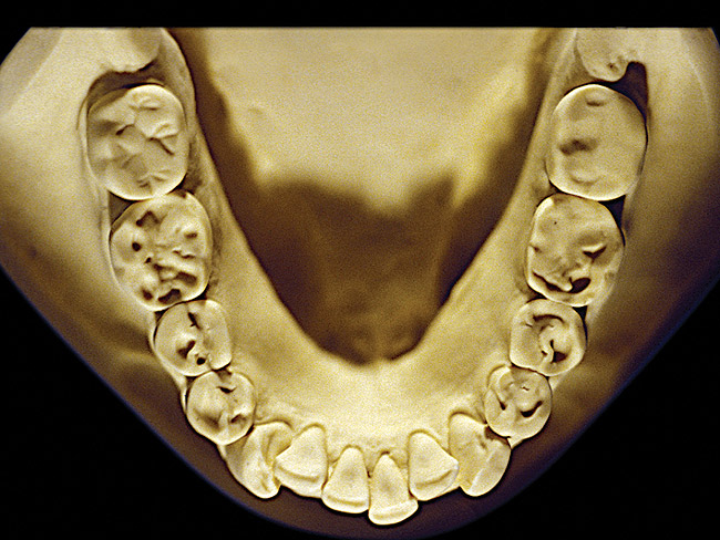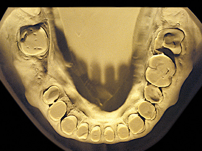So that the previous example is not misleading, the behavioral profile of the toothpaste abuser is not necessarily the "caries-free immaculate oral hygiene patient," but can be virtually anyone who brushes their teeth with toothpaste. Figure 11 and Figure 12 illustrate a more advanced example of toothpaste abuse showing a patient with multiple restorations and some unkempt teeth. The anatomical details were faded with a sandblasted appearance and the silver alloy restorations were highly polished. The facial surfaces of the mandibular canines and premolars were affected the most, creating the pathognomonic pattern. Figure 13 and Figure 14 are a close-up view of this area, illustrating a cupping or cratering effect, but of the asymmetrical variety. This patient did not like the color of his teeth and spent an inordinate amount of time brushing his teeth. Again, likewise due to the exclusive use of a round-ended, soft-bristle toothbrush, note there was no cervical gingival recession in this case either. When the featured casts illustrating toothpaste abuse (Figure 7, Figure 8, Figure 9, Figure 10, Figure 11, Figure 12, Figure 13 and Figure 14) were hand-articulated, the worn surfaces did not match up and the diagnosis of toothpaste abuse was confirmed.