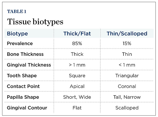 It is much easier to mask the presence of an implant in a patient with a thick/flat biotype for several reasons. Thick bone is less prone to resorption, encourages revascularization during healing, and bodily holds up the soft tissue. Similarly, thick gingiva recedes less, is easier to handle surgically, and heals faster due to its vascularity. Perhaps most significantly, there is simply less need for highly undulated tissue due to the inherently stunted papilla shape, apically located contact point, and compressed gingival contour. These naturally low esthetic demands benefit all parties.