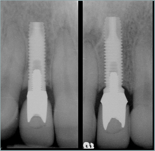 Single implants, or those located between two natural teeth, typically require a minimum of 1.5 mm of bone between the edge of the implant and the root surface.4 In the case of replacement of a lone maxillary central incisor, there should be a distance at least 2 mm to 2.5 mm between tooth and fixture, as the peak of bone sandwiched between centrals is customarily wider. The space between an implant and another should be even farther apart; this scenario requires no less than 3 mm of interproximal bone. Two maxillary central incisor implants ought to be at least 4 mm to 4.5 mm apart to support the naturally wider configuration in this area. Taking into account the information above and considering the natural width and emergence profile of teeth, the standard implant diameter used for lateral incisors is less than 4 mm, while the diameter used to substitute central incisors and canines does not typically exceed 5 mm.6 Obviously, the recommended diameter varies depending on the individual patient’s dental idiosyncrasies. Some patients simply do not possess enough mesio-distal crestal bone or room between the roots for esthetic conventional implant placement. Replacement of a failing peg-sized maxillary lateral incisor, for example, may require orthodontic movement to create sufficient interdental space (Figure 6, Figure 7 , Figure 8 and Figure 9). If the patient will not or cannot manage implant space creation, alternative therapies include restoration with a removable appliance, resin-bonded fixed prosthesis, or conventional fixed partial denture.