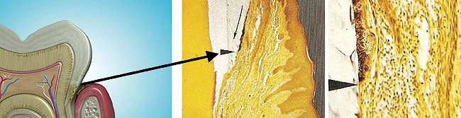 The host periodontal sulcus responds in predictive ways to associated plaque in localized periodontitis. Verderame et al33 discovered epithelial cavitations and ulcerations in response to the microorganisms entrapped in the region. The development of epithelial breakdown and ulcerations might help explain findings by Matheny et al,34 who, while evaluating the microcirculatory dynamics associated with human gingivitis, discovered a significant increase in the number of blood vessels visible in microscopic fields. Kerdvongbundit et al35 evaluated inflammatory changes in the microcirculatory and micro-morphologic dynamics of human gingiva before and after conventional treatment (scaling and root planing). Blood flow measured with laser doppler flowmetry demonstrated a statistically significant blood flow increase when the gingival tissues were inflamed. These returned to normal after treatment and remained stable for 3 months posttreatment. Giorgio Cimasoni of the University of Geneva School of Dentistry Department of Periodontics demonstrated the close proximity and relationship of the bloodstream to the periodontal pocket (Figure 3). The increased exposure of the bloodstream during infection helps explain how perio-pathogenic cells might become involved systemically or have systemic effects on the host immune system as the host responds to these pathogens.