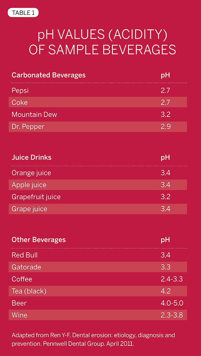 While certain beverages and foods are known to be acidic, common eating and drinking habits do not become a problem until the amount ingested increases or the saliva in the mouth no longer provides a diluting or buffering of these acids. Carbonated soda, fruit juices, and sport drinks are very acidic, with pH ranges below 4.0.13-18 Table 1 lists some pH values of beverages.17,19,20 However, it is not a single incidence of drinking these acidic beverages that causes the damage, but their prolonged use.18 Juices with citric acid (eg, orange, grapefruit, and lemon juice) are doubly damaging to tooth enamel because the citrate molecule joins to the calcium ion, reducing the potential of the saliva to remineralize the enamel.21 It has been shown that athletes using sports drinks are not at increased risk of dental erosion compared with the general population: Frequency of use is a more significant contributing factor.20,22