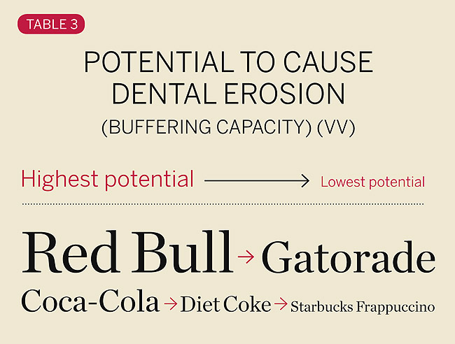 Although much of the focus of dental erosion has been on acidic beverages, dental erosion has also been associated with some common fruits and vegetables with pH levels that fall below the range that contributes to dental erosion (Table 2). Even some routinely used condiments are in the acidic range that can cause tooth damage.19,20 While certain foods and beverages may be more acid than others, there is another factor that contributes to dental erosion—buffering capacity (ie, the amount of the substance needed to reverse the acid pH). The higher the buffering capacity, the greater the potential for dental erosion. Owens evaluated the potential effects of pH and buffering capacity on dental erosion:23 The beverages evaluated for potential to cause dental erosion from the highest to lowest are listed in Table 3. Based upon his results, the lowest pH beverage, Starbucks Frappuccino, had the lowest buffering capacity, (meaning that it had the least potential to cause dental erosion), while Red Bull had the greatest potential to cause dental erosion.
