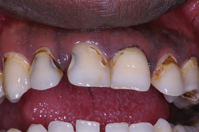 If a patient has risk factors that can contribute to dental erosion, an examination will reveal clinical signs and symptoms of dental erosion. It is unlikely that dental erosion will be seen without other contributing factors. Tooth wear and abrasion typically occur in combination with dental erosion. In the clinical evaluation of tooth surfaces for the diagnosis of erosion, what is typically seen are smooth, shiny surfaces of the teeth where the usual anatomic form of the tooth should be. In patients ingesting very acidic diets, the facial surfaces of anterior teeth are very smooth, and if the beverages being ingested have high sugar content, these teeth may have caries at their facial gingival margins (Figure 1). The occlusal surfaces of posterior teeth in the more advanced stages of erosion due to regurgitation may have extensive exposed dentinal areas with loss of anatomic form (Figure 2). In some cases, the chemical erosion combined with toothbrush–toothpaste abrasion can remove all the enamel, leaving only the dentin exposed (Figure 3). These teeth may exhibit sensitivity. Posterior teeth with restorations may demonstrate fillings that are higher than the surrounding occlusal surfaces of the enamel. Anterior teeth may demonstrate more incisal translucency due to tooth loss at the incisal edge. In patients with the eating disorder bulimia nervosa, who vomit, the hydrochloric acid causes extensive damage to the lingual surfaces of the anterior teeth, where the enamel is lost, leaving exposed dentin (Figure 4).
