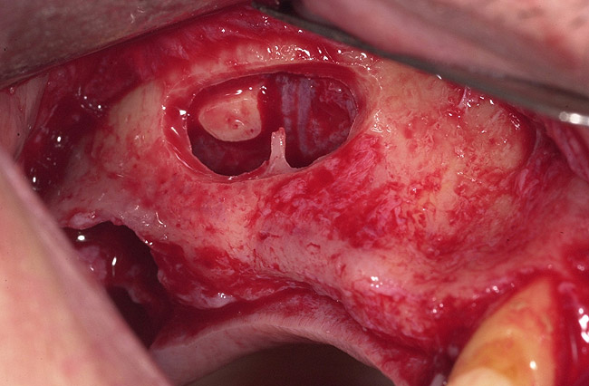 The incidence of sinus septum is 24% to 41%, with high variability in size and location; identification of the septum before the surgical sinus lift will reduce the possibility of complications.3,4 The location of the septum will dictate the size and design of the lateral wall osteotomy. The septum is isolated through careful lateral window osteotomy, defining two compartments mesial and distal to the septum. Figure 22, Figure 23, Figure 24, Figure 25 and Figure 26 illustrate proper management of the septum.