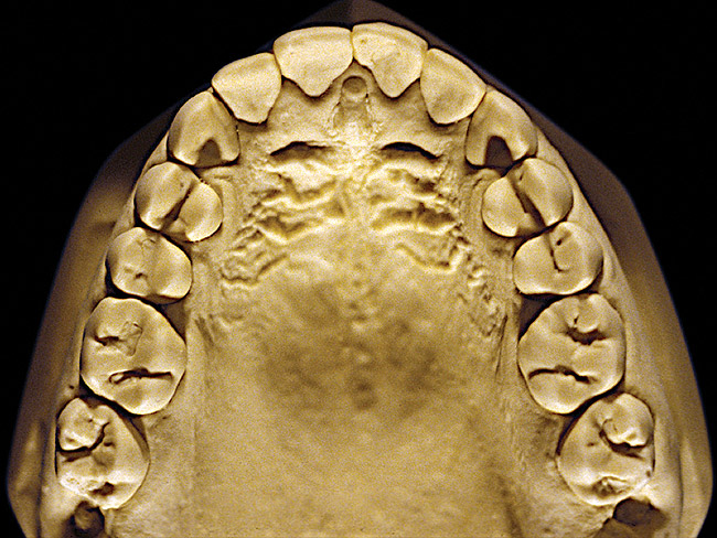 The patient shown in Figure 3 and Figure 4 exhibited severe NCLTS from bruxism. Examination of the casts indicated that the NCLTS was progressively greater toward the anterior teeth. Cupping and cratering was not present because there was no secondary cause. Figure 5 and Figure 6 detail another bruxism patient, but to a lesser degree and one with cupping/cratering caused by toothpaste. The cups or craters were not caused from bruxism because the teeth could not touch the bottom of the invaginations. In both featured patients, upon hand-articulating the casts, the NCLTS facets matched up and the diagnosis of bruxism was confirmed.