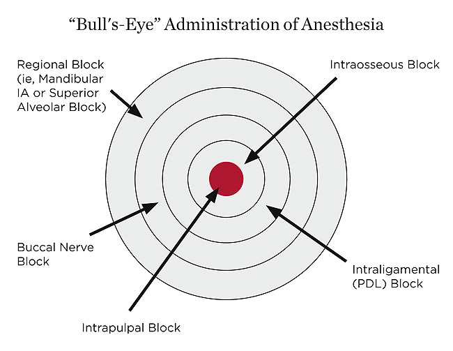 The goal in administering supplemental nerve blocks is to start systematically with a buccal nerve block in mandibular teeth and PDL block on maxillary teeth and progress the injection of anesthesia (as indicated) to an intrapulpal injection. An example of this graphically is the “bull’s eye” approach (Figure 2) from regional to intrapulpal anesthesia.8
