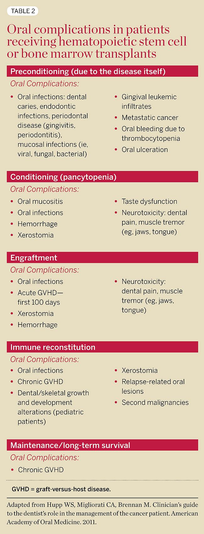 Patients with some types of malignancies, such as leukemia or lymphoma, may undergo hematopoietic stem cell or bone marrow transplant. Oral complications, including mucositis and myelosuppression, can occur at several stages of the transplant (Table 2).6 Another rare oral finding is graft-versus-host disease (GVHD).
