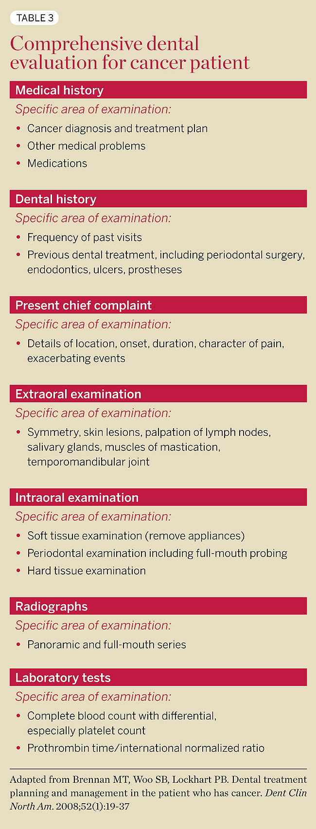 The pretreatment oral examination must include a complete extraoral and intraoral examination, as well as panoramic and full-mouth series of radiographs. Careful attention must be given to the presence of any existing carious lesions, broken or unserviceable restorations, periodontal or endodontic infections, other soft tissue problems, and any potential problems that could be exacerbated during the cancer treatment (Table 3).10