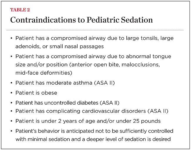 Sedation of a child is a continuum. Thus, it is not always possible to predict how a child will respond. Dentists intending to provide minimal sedation should be able to diagnose and manage physical consequences in the event the level of sedation becomes deeper than expected. For a list of indications and contraindications to the administration of pediatric sedation, see Table 1 and Table 2.