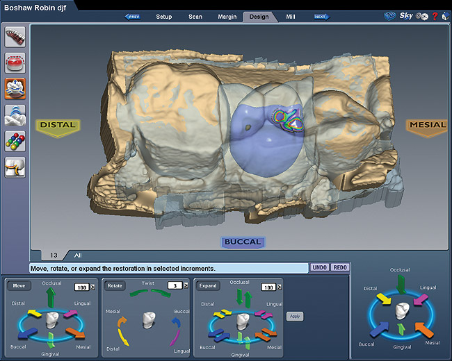 The software programs for the chairside CAD/CAM systems are more involved than those for the digital impression systems, because a CAD program must provide the necessary tools to virtually design the restoration on the computer monitor. A variety of tools—some intuitive, some not so intuitive—are featured in each manufacturer’s software program as aids in customizing the restoration design to the specific needs of the clinical case at hand. Generally, a 2-day basic training course is provided for the chairside CAD/CAM systems to learn the clinical workflow, including the design process. Although this may seem like a much longer and more drawn out learning curve, in most productive offices using chairside CAD/CAM systems, it is not the dentist but the dental assistants or dental laboratory technicians who are the primary “designers.” As with most technology advances, those who use it the most, use it the best.