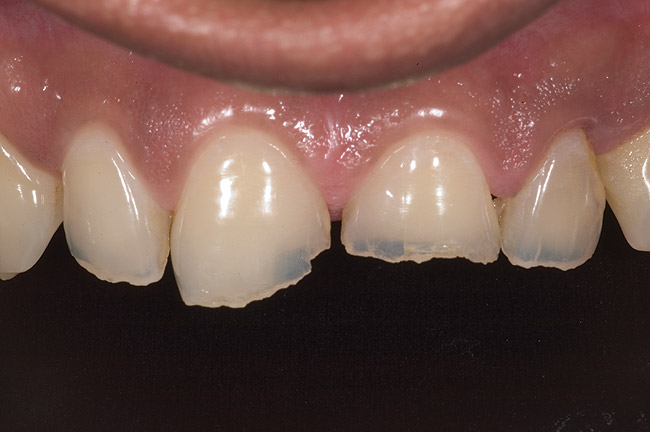 Acid dissolves the palatal enamel of upper anteriors, thus exposing the underlying dentin. This makes teeth appear higher in chroma and leads to hypersensitivity as well as supraeruption of opposing incisors. Clinically, this restricts the space needed to restore lost palatal tooth structure (Figure 1 and Figure 2).
