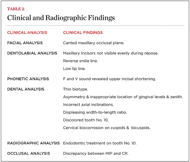Examination revealed that palatal surfaces of teeth Nos. 6 through 11 showed severe loss of tooth structure, with mild wear on the lower incisors and loss of anterior guidance (Figure 5 through Figure 7). The palatal TSL was consistent with the clinical picture presented by patients with gastric reflux. A detailed medical history was taken, and the patient complained of having heartburn and acidity at least 4 out of 7 days a week. He had never sought treatment for it and used over-the-counter medication when needed. He was a nonsmoker, with occasional intake of alcohol. He had a high-stress job with irregular meal times. A thorough smile and dental analysis11 was carried out; the findings appear in Table 2.