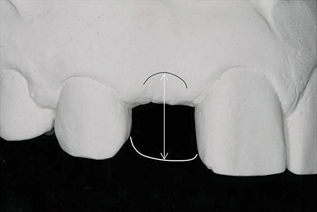 Implants must be placed in specific orientation to the soft-tissue reference of the gingival zenith. Specifically, the implant/abutment interface should be located 3 mm apical and displaced 2 mm palatal to the gingival zenith of the planned crown.