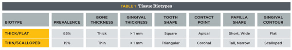 It is much easier to mask the presence of an implant in a patient with a thick/flat biotype for several reasons. Thick bone is less prone to resorption, encourages revascularization during healing, and bodily holds up the soft tissue. Similarly, thick gingiva recedes less, is easier to handle surgically, and heals faster due to its vascularity. Perhaps most significantly, there is simply less need for highly undulated tissue due to the inherently stunted papilla shape, apically located contact point, and compressed gingival contour. These naturally low esthetic demands benefit all parties.