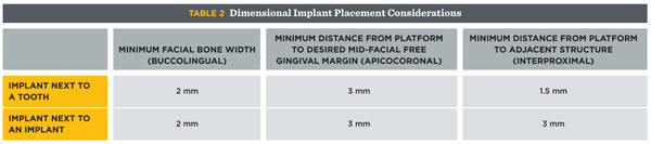 Based on the tenets discussed above, implant placement should adhere to several morphologic guidelines, all of which center around the notion that the fixture must follow the path of the ideal emergence profile (ie, be prosthetically friendly) (Table 2). Use of a surgical guide aids the practitioner in this mission, but even with a guide, the clinician must at all times have a kinesthetic sense of where the implant needs to be. Insertion in the anterior zone favors palatal over buccal angulation because a platform tilted facially may thin the alveolar plate, thus promoting recession, and also result in a tooth that appears to protrude or be discolored due to abutment visibility through the crown or mucosa. Palatal orientation, with maintenance of at least 2 mm of buccal bone, offers the restorative dentist more flexibility with the emergence profile and resists tissue resorption.8,18 Similarly, the apicocoronal position of the implant at the buccal influences these factors. Natural teeth exhibit a free gingival margin-to-osseous crest distance of 3 mm at their mid-facial aspects, and this observation applies to adjacent implant restorations as well. To complement the facial gingival contour of its neighbors, the platform of the implant should lie roughly 3 mm apical to the desired mucosal margin of the crown, which should line up more or less with the free FGM of the existing anterior dentition.18,26,27 A platform located further apically but supracrestal or at the crest may cause a deep, hard-to-clean peri-implant pocket to form; one that lies subcrestal may initiate buccal bone loss and subsequent soft tissue recession in a patient with thin, non-augmented buccal bone. Even so, a more apically situated implant provides plenty of room for shaping an archetypal emergence profile; the same cannot be said of a more coronally located implant (< 3 mm from platform-to-mucosal margin), which stymies any normal-appearing emanation of the crown from the maxilla. Finally, the interproximal bone and its anticipated overlying papilla depend on the mesiodistal space between the implant platform and the adjacent tooth or implant; the wider the distance, the greater the odds of bone retention and papillary formation, though the papilla expected are more likely to be short and squat than long and thin.17,21