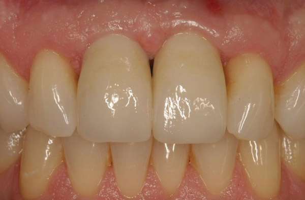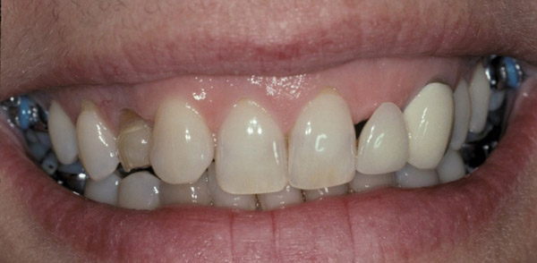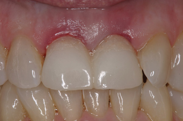 Single implants, or those located between two natural teeth, typically require a minimum of 1.5 mm of bone between the edge of the implant and the root surface.4 In the case of replacement of a lone maxillary central incisor, there should be a distance at least 2 mm to 2.5 mm between tooth and fixture, as the peak of bone sandwiched between centrals is customarily wider. The space between an implant and another should be even farther apart; this scenario requires no less than 3 mm of interproximal bone. Two maxillary central incisor implants ought to be at least 4 mm to 4.5 mm apart to support the naturally wider configuration in this area. Taking into account the information above and considering the natural width and emergence profile of teeth, the standard implant diameter used for lateral incisors is less than 4 mm, while the diameter used to substitute central incisors and canines does not typically exceed 5 mm.6 Obviously, the recommended diameter varies depending on the individual patient’s dental idiosyncrasies. Some patients simply do not possess enough mesio-distal crestal bone or room between the roots for esthetic conventional implant placement. Replacement of a failing peg-sized maxillary lateral incisor, for example, may require orthodontic movement to create sufficient interdental space (Figure 6 through Figure 9). If the patient will not or cannot manage implant space creation, alternative therapies include restoration with a removable appliance, resin-bonded fixed prosthesis, or conventional fixed partial denture.