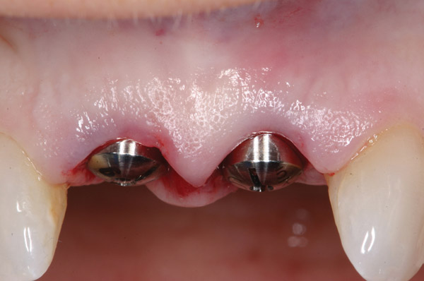 Triggering at once the most gratifying, frustrating, and fearsome sentiments, dentistry in the visible section of the mouth is a complex undertaking, sometimes subtly but occasionally blatantly so. Cases involving implants disturb not only the dental architecture but also that of bone and gingiva, structures that change shape easily upon violation, further complicating matters. Despite strides in regenerative surgery and prosthetic manipulation, a natural-appearing relationship between papilla, surrounding mucosa, native teeth, and implant crowns is exasperatingly difficult to achieve. A functional, long-lasting anterior implant restoration is probable but one that is, moreover, indistinguishable from its indigenous neighbors is less feasible. Blame the extended epithelial connection between titanium alloy and mucosa, any inherent dearth of osseous or soft tissue and possibly capricious healing.1,2 Thus, the most pressing question is also the most superficial: how much tooth and gum does the patient expose upon smiling? To put things bluntly, what can the patient put up with (and his or her clinicians get away with) cosmetically? The combination of physical boundaries and patient tolerance determines the appropriate restorative solution for partial edentulism in the esthetic zone. The lip line is the primary determinant of esthetic success; a low lip line (exposure of less than 75% of teeth upon smiling) covers a multitude of sins.3 This notion is tempered by the fact that certain patients demand perfection regardless of whether anyone else sees their teeth. These patients possess a high esthetic concern and must be treated as if they had high smile lines. For them as well as those with average (exposure of 75% to 100% of teeth and only interproximal gingiva) and high (exposure of all teeth and a contiguous band of gingiva) smiles, treatment consists of possible augmentation of bone and/or mucosa, non-buccally-oriented implant placement, delivery and progressive alteration of interim restorations to refine tissue draping, and a precisely hued final prostheses. This article reviews treatment steps and decision points that the healthcare team and patient must undergo to reach a satisfactory, agreed-upon implant resolution to partial edentulism in the anterior area.