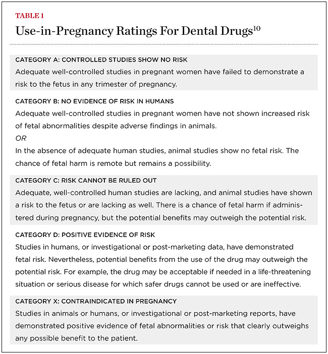 Accurate human risk assessment is impossible to obtain for many newly marketed or infrequently prescribed drugs. Fortunately, the therapeutic agents used in dental practice are used quite frequently, and evidence is available to evaluate their potential risk (view Table 2 online at www.dentalaegis.com/go/id582). In recent years, new agents have come to the market and some changes have occurred to the previous risk classifications. This updated drug listing provides a summary of the current understanding of risk during pregnancy.