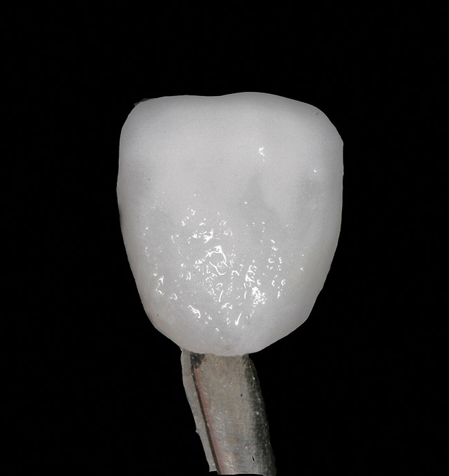 The use of CAD/CAM technology expanded machinable ceramic fabrication by allowing scanning, designing, and milling of either a full-contoured restoration or a single- or multiple-unit framework by a computer.12 Two different CAD/CAM methods are used. The first method is an additive version in which an electrodeposition of powdered material is applied layer by layer to a conductive die through an electrical current.13 This technique is also referred to as rapid prototyping. The other (and more common) method is a subtractive method in which a substructure or full-contour restoration is milled from a solid block of ceramic material. The available materials for the subtractive CAD/CAM processing include silica-based ceramics, infiltration ceramics, lithium-disilicate ceramics, and oxide high-performance ceramics.14 For example, lithium disilicate is actually milled as lithium metasilicate and then heated to 820°C in a two-stage oven. During this firing cycle, there is a controlled growth of the grain size (0.5 μm to 5 μm) and a conversion of metasilicate crystals to disilicate crystals. This crystallization process not only changes the physical composition and strength but also causes the restoration to reach the indicated ceramic shade (Figure 8 through Figure 11).15