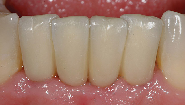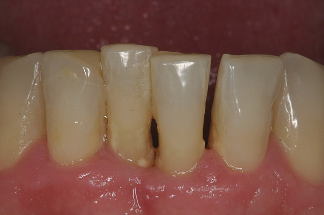 A 53-year-old male presented with localized advanced periodontal disease of the mandibular incisors. Teeth Nos. 23 to 26 exhibited Class II mobility because of advanced bone loss (Figure 1). The teeth had migrated out of position over the years, and a diastema had developed between No. 24 and No. 25 (Figure 2). The patient complained about the poor esthetic appearance of these teeth, and he was able to perceive their loss of strength on function as a result of their mobility.