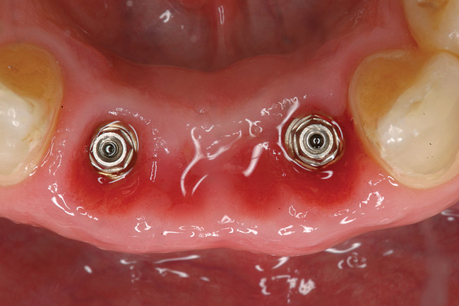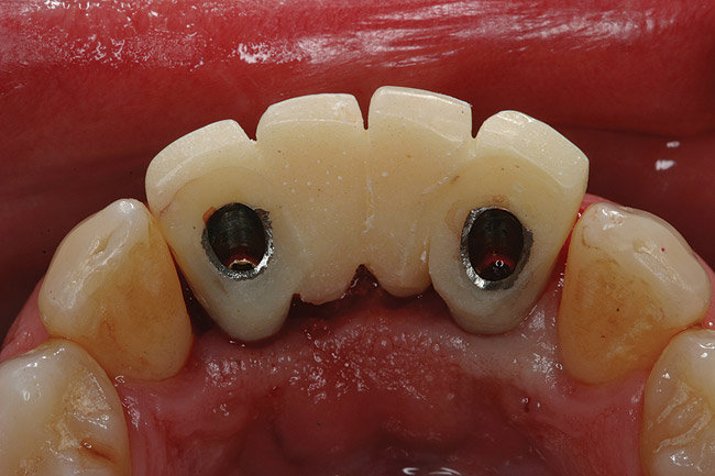 Preoperatively, 1 g of amoxicillin was administered. Using local anesthesia (lidocaine 1:100,000 epinephrine), extractions of teeth No. 23 to No. 26 were performed without raising a flap and with gentle luxation to preserve the remaining facial osseous plate. The sockets were curetted prior to implant placement. A vacuum-formed surgical guide, fabricated based on a diagnostic wax-up of the desired tooth positions for the subsequent fixed prosthesis, was used during implant placement. Osteotomies were performed at sites No. 23 and No. 26 and positioned toward the lingual aspects of the sockets (Figure 3A and Figure 3B). Two tapered implants (OsseoTite™ 313, BIOMET 3i™, Palm Beach Gardens, FL) measuring 3.25 mm x 13 mm were placed. Conical prosthetic abutments (3-mm height) were used to facilitate joining the two implants in a screw-retained fixed partial denture (Figure 4). A laboratory-processed acrylic-resin provisional restoration was altered to allow connection to the temporary cylinders. The provisional was placed into the vacuum-formed surgical guide that was now used to maintain the provisional in the correct 3-dimensional position (Figure 5) while being attached to the temporary cylinders with acrylic resin intraorally. Once a sufficient amount of acrylic resin was placed to secure the cylinders to the provisional, it was removed from the mouth and its contours were completed at the laboratory bench (Figure 6A). The two central incisor sockets were grafted with small-particle allograft material (Puros® Allograft, Zimmer Dental, Carlsbad, CA) to maintain gingival architecture beneath two ovate pontics (Figure 6B). The provisional restoration was inserted and the screws tightened to 20 Nt-cm of torque.