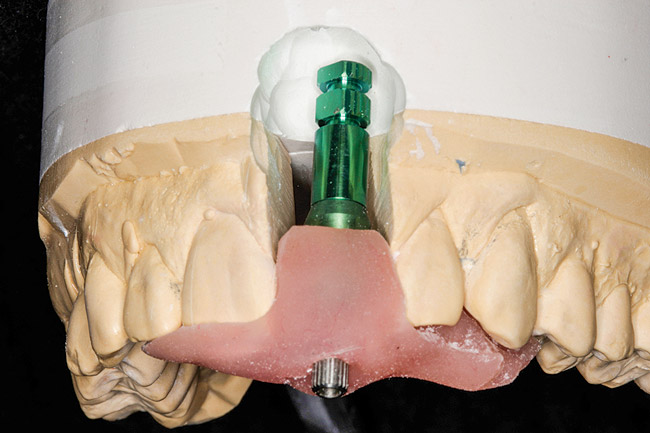 The restorative dentist can duplicate the contours of the extracted tooth for the new screw-retained provisional following these instructions: First make an index of implant position with a transfer coping. Then, either pour up a working cast or alter the cast used to fabricate the surgical guide. The cast is altered in the area of the implant fixture to allow the indexed transfer coping to seat with the appropriate analog attached (Figure 2).