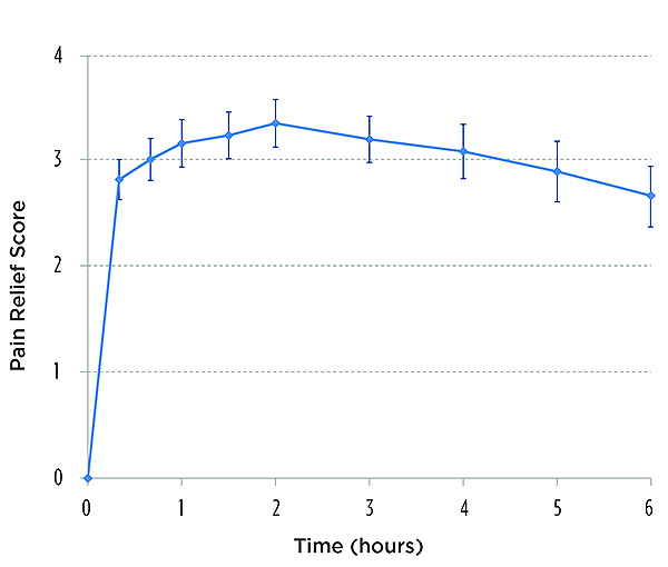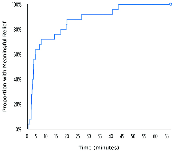 The time effect curve for mean pain relief (Figure 2) also displayed a rapid onset (within 20 minutes), high peak effects between 40 minutes and 4 hours, and an apparent duration of action at least through 6 hours. The median onsets of first perceptible and meaningful pain relief were 86 seconds (95% confidence interval; 64 to 172 sec) and 172 seconds (95% confidence interval; 132 to 735 sec), respectively, again confirming the rapid onset of the drug. The Kaplan-Meier curve of the times to meaningful relief among participants is shown in Figure 3. Only one participant did not obtain meaningful pain relief.