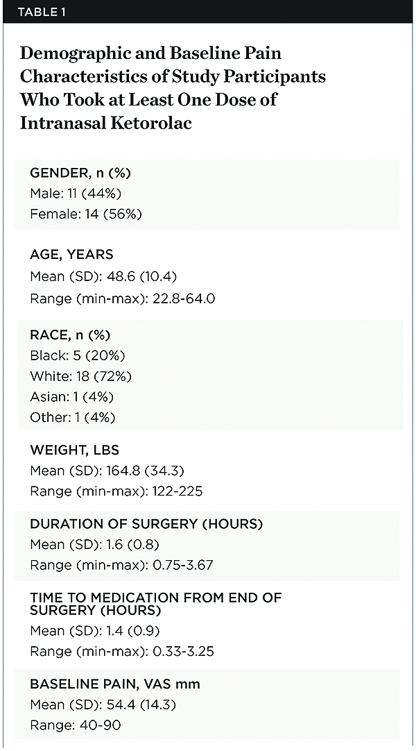 A total of 31 patients consented to the study and 25 were dosed with intranasal ketorolac 31.5 mg. Of the six patients who were not dosed one reported a history of aspirin-sensitive asthma immediately before surgery (an absolute contraindication for the administration of all NSAIDs), another had a body mass index (BMI) of 31 which at the time precluded enrollment (maximum BMI was 29 until an IRB-approved amendment increased it to 33), and a third did not receive his implants because of the need for significant bone grafting during surgery. Three patients who received their implants did not achieve the required VAS pain intensity score of 40 mm within 4 hours of the completion of their surgery. Therefore, 89% (25/28) of the participants obtained a level of at least moderate postsurgical pain within 4 hours after the placement of one to three implants. The demographic characteristics and the mean baseline pain score of the study population are shown in Table 1.