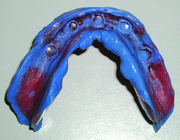 Once the laboratory reported that it had completed fabrication of the custom abutments and their retention cap attachments (Figure 4 and Figure 5), an impression was taken in the mouth using the original immediate denture. The intaglio of the original immediate denture had been modified by the implant surgeon to accept the presence of the healing abutments—called “sulcus formers” in the ANKYLOS system—placed when the implants were uncovered after osseointegration (Figure 6 and Figure 7). This impression was used at the laboratory to orient further adaptations of the denture’s intaglio to receive the retention cap attachments that would integrate with the custom abutments and the system’s stabilizing bar (Figure 8). Simultaneous to abutment fabrication, the laboratory created a mounting jig to correctly position the abutments on the implants and provide a proper path of insertion as required for the non-indexed abutments (Figure 9). The denture and its SynCone components were then returned to the author’s office for the final chairside denture insertion procedures.