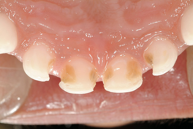 One of the first clinical signs of the presence of ECC is the white-spot lesion—usually first seen on the maxillary incisors.26 The development and location of white-spot lesions are linked to:27