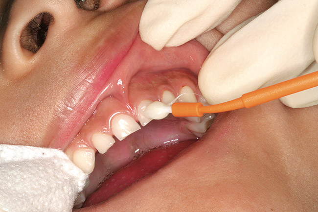 Open the child’s mouth. Remove excess saliva from the teeth with a gauze sponge. Apply a thin layer of the varnish to all surfaces of the teeth (Figure 3). The varnish will thicken immediately once it comes in contact with saliva.